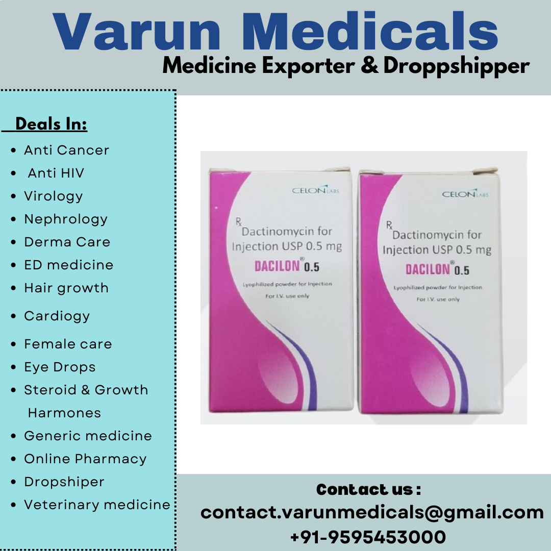 We, Varun Medicals Are The Leading Supplier, Dealer, Exporter For Dactinomycin For Injection In Delhi, Pune, Mumbai, Haryana, Rajasthan, Kolkata, Chennai, Bangalore, Hyderabad, Ahmedabad, Surat, Visakhapatnam, Jaipur, Lucknow, Kanpur, Patna, Bhubaneswar, Dehradun, Ranchi, Jhasi, Riva, Sagar, Akola, Amravati, Raipur, Nagpur, Coimbatore, Salem, Madurai, Kochi, Ludhiana, Goa, Assam, India We Have All Types Of Dactinomycin For Injection Available And We Are Supplier, Dealer, Exporter In Delhi, Pune, Mumbai, Haryana, Rajasthan, Kolkata, Chennai, Bangalore, Hyderabad, Ahmedabad, Surat, Visakhapatnam, Jaipur, Lucknow, Kanpur, Patna, Bhubaneswar, Dehradun, Ranchi, Jhasi, Riva, Sagar, Akola, Amravati, Raipur, Nagpur, Coimbatore, Salem, Madurai, Kochi, Ludhiana, Goa, Assam, India
