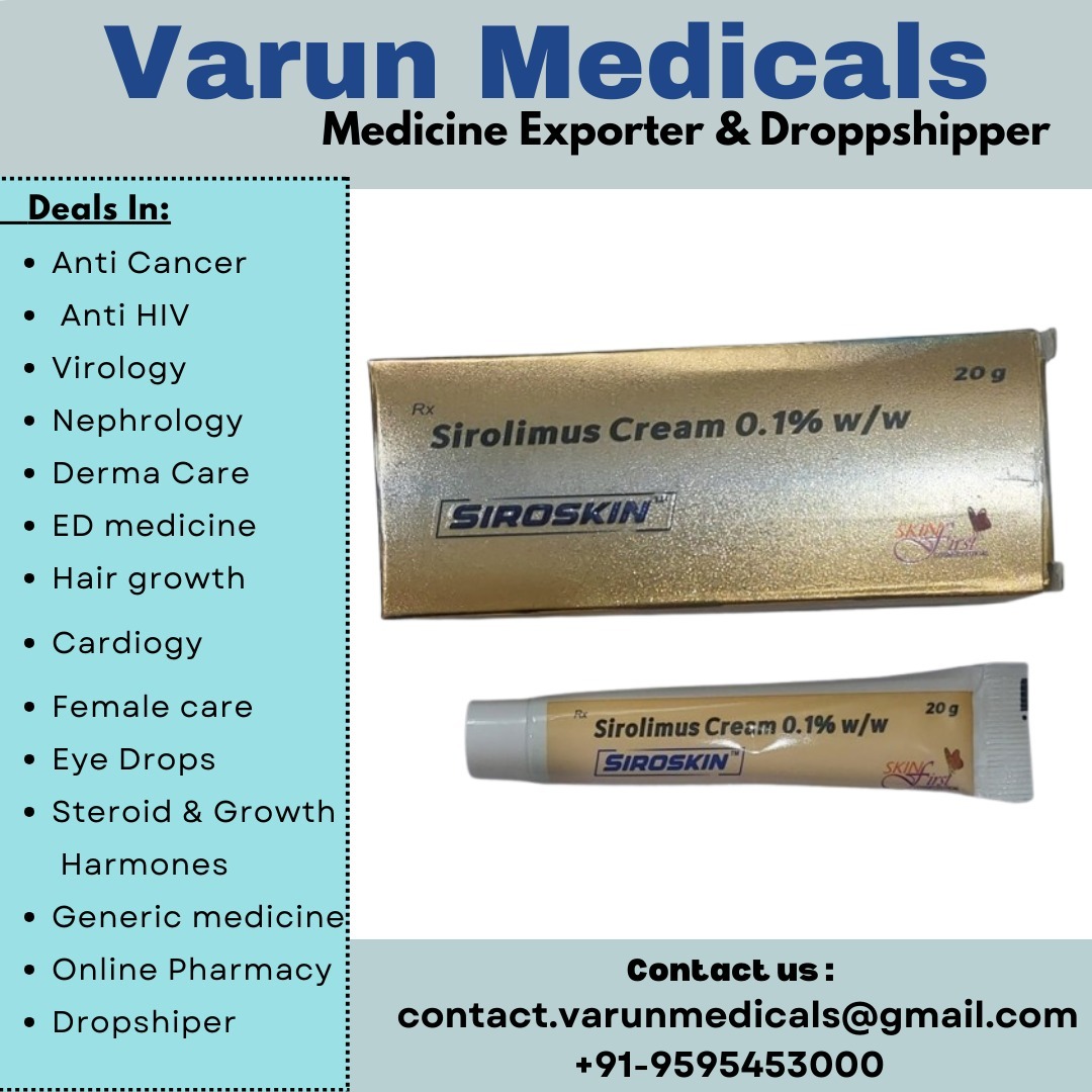 We, Varun Medicals Are The Leading Supplier, Dealer, Exporter For Sirolimus Cream In Delhi, Pune, Mumbai, Haryana, Rajasthan, Kolkata, Chennai, Bangalore, Hyderabad, Ahmedabad, Surat, Visakhapatnam, Jaipur, Lucknow, Kanpur, Patna, Bhubaneswar, Dehradun, Ranchi, Jhasi, Riva, Sagar, Akola, Amravati, Raipur, Nagpur, Coimbatore, Salem, Madurai, Kochi, Ludhiana, Goa, Assam, India We Have All Types Of Sirolimus Cream Available And We Are Supplier, Dealer, Exporter In Delhi, Pune, Mumbai, Haryana, Rajasthan, Kolkata, Chennai, Bangalore, Hyderabad, Ahmedabad, Surat, Visakhapatnam, Jaipur, Lucknow, Kanpur, Patna, Bhubaneswar, Dehradun, Ranchi, Jhasi, Riva, Sagar, Akola, Amravati, Raipur, Nagpur, Coimbatore, Salem, Madurai, Kochi, Ludhiana, Goa, Assam, India